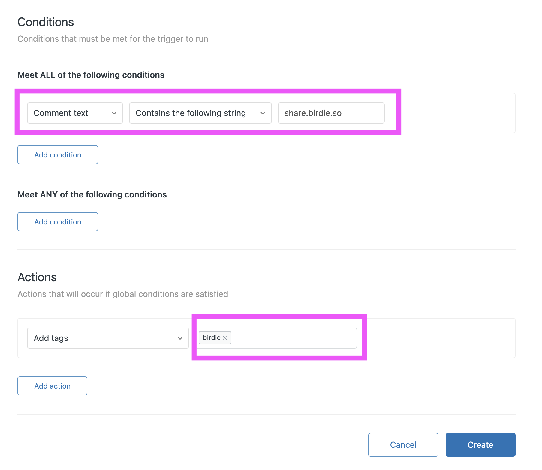 3. Create a second tag <mark style="color:purple;">`Comment text`</mark> <mark style="color:yellow;">`Contains the following string`</mark> <mark style="color:purple;">`share.birdie.so`</mark>